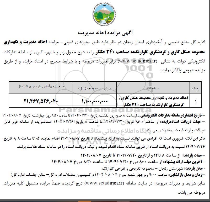 اداره کل منابع طبیعی و آبخیزداری استان زنجان در نظر دارد طبق مجوزهای قانونی، مزایده احاله مدیریت و نگهداری مجموعه جنگل کاری و گردشگری گاوازنگ به مساحت 340 هکتار را به شرح جدول زیر و با بهره گیری از سامانه تدارکات الکترونیکی دولت به نشانی ستاد ایران برابر مقررات مربوطه و با شرایط مندرج در اسناد مزایده و از طریق مزایده عمومی واگذار نماید