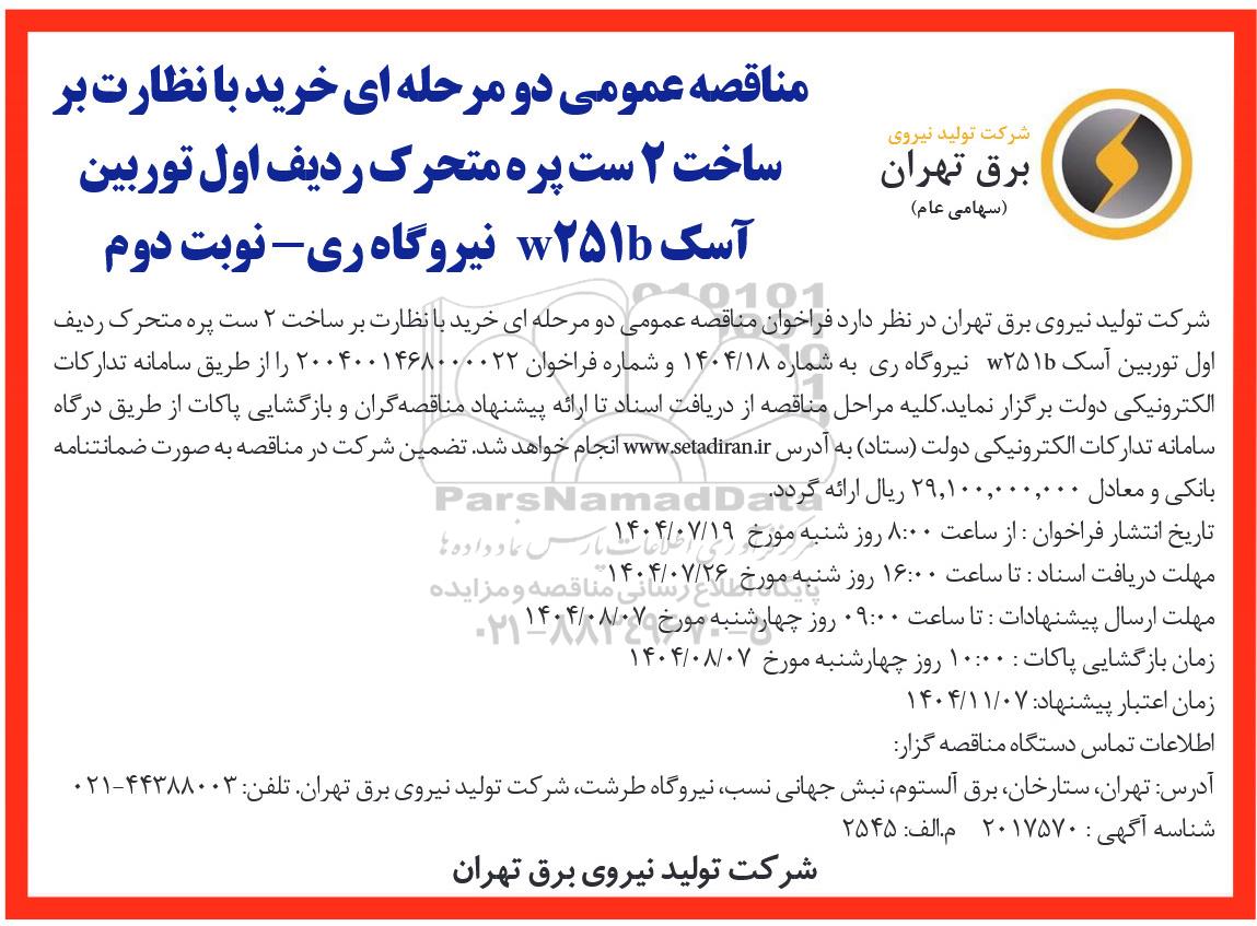 شرکت تولید نیروی برق تهران در نظر دارد فراخوان مناقصه عمومی دو مرحله ای خرید و نظارت بر ساخت 2 ست پره متحرک ردیف اول توربین آسک W251B نیروگاه ری به شماره 1404/18 و شماره فراخوان 2004001468000022 را از طریق سامانه تدارکات الکترونیکی دولت برگزار نماید.