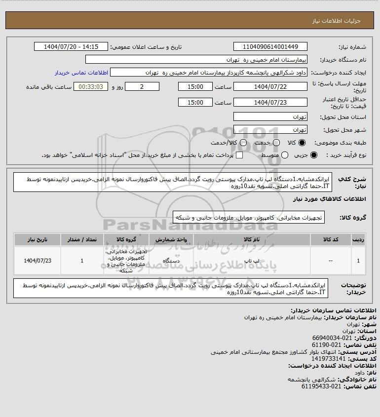 شرح کلی نیاز: ایرانکدمشابه.1دستگاه لپ تاپ.مدارک پیوستی رویت گردد.الصاق پیش فاکتوروارسال نمونه الزامی.خریدپس ازتاییدنمونه توسط IT.حتما گارانتی اصلی.تسویه نقد10روزه