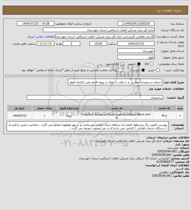 شرح کلی نیاز: اجرای دستمزدی بخشی از  اسکلت 2 بلوک از پروژه اقدام ملی اکباتان اهواز
