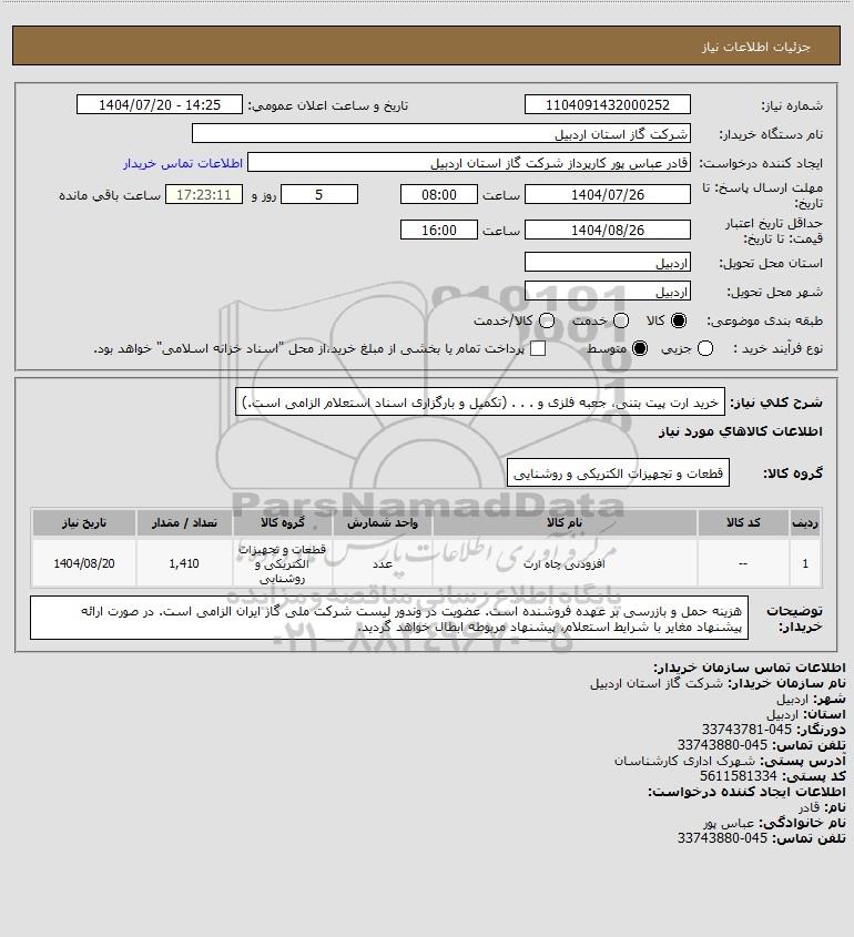 استعلام بها و موضوع استعلام استعلام خرید ارت پیت بتنی، جعبه فلزی و . . . (تکمیل و بارگزاری اسناد استعلام الزامی است.) به اطلاع کلیه شرکتها و افراد متخصص واجد شرایط میرساند، آگهی گذار در نظر دارد از طریق استعلام بها، نسبت به انتخاب و دریافت پیشنهادات اقدام نماید. این استعلام با کد آگهی ثبت شده در سامانه خبرگزاری پارس نماد : 9685754 منتشر شده است. مشخصات استعلام : تاریخ شروع استعلام: 1404/07/20 آخرین مهلت ارسال پیشنهاد قیمت : 1404/07/26 و محل اجرای پروژه : استان اردبیل میباشد. استعلام قیمت مورد درخواست : استعلام خرید ارت پیت بتنی، جعبه فلزی و . . . (تکمیل و بارگزاری اسناد استعلام الزامی است.) با دستهبندیهای تخصصی و گروه های مرتبط : ابزار دقیق, برقگیر،صاعقه گیر و اینترکام, انواع کلید و پریزهای برقی و صنعتی, انواع تابلو و راکهای مخابراتی و برقی, قطعات بتنی, تجهیزات نفت و گاز, تجهیزات برق و الکترونیک, استعلام اطلاع رسانی میگردد.