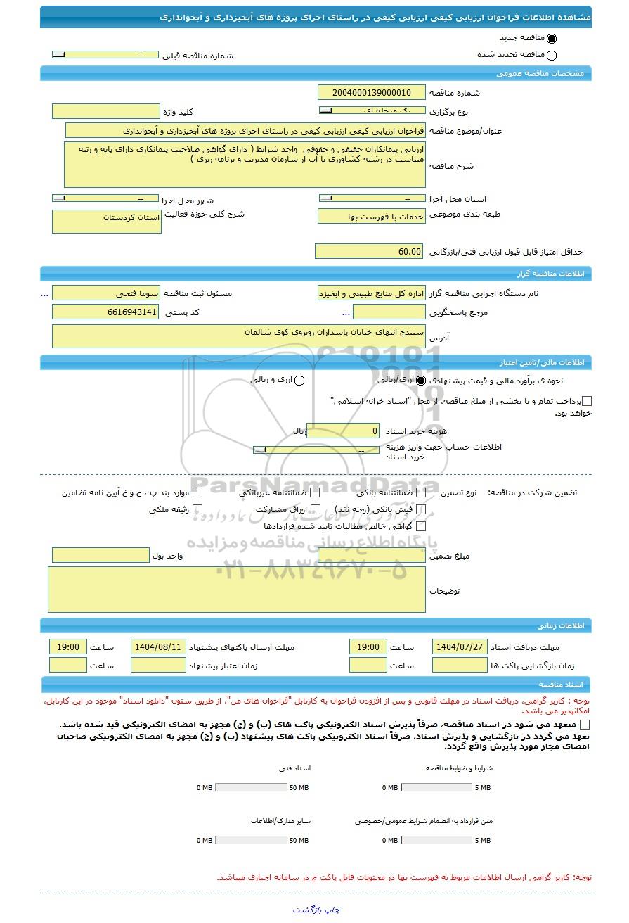عنوان/موضوع مناقصهفراخوان ارزیابی کیفی ارزیابی کیفی در راستای اجرای پروژه های آبخیزداری و آبخوانداری