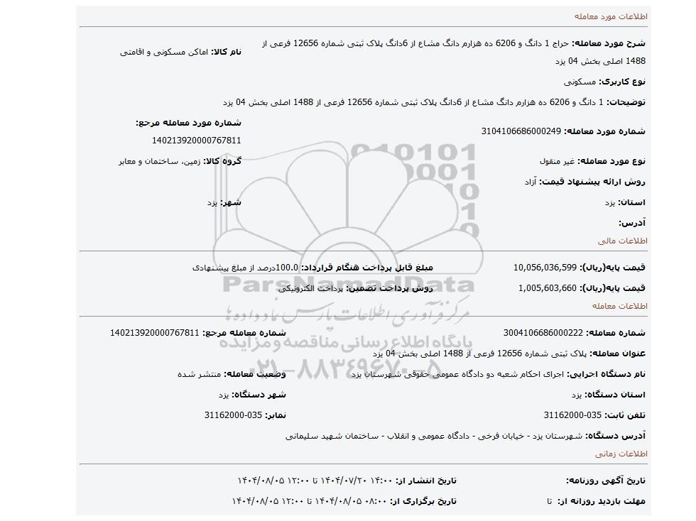 | شرح مورد معامله: حراج 1 دانگ و 6206 ده هزارم دانگ مشاع از 6دانگ پلاک ثبتی شماره 12656 فرعی از 1488 اصلی بخش 04 یزد | نام کالا: اماکن مسکونی و اقامتی | |