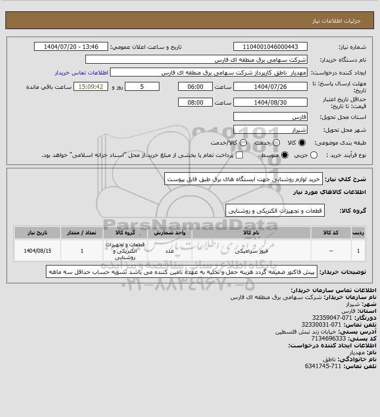نام دستگاه خریدار:شرکت سهامی برق منطقه ای فارس