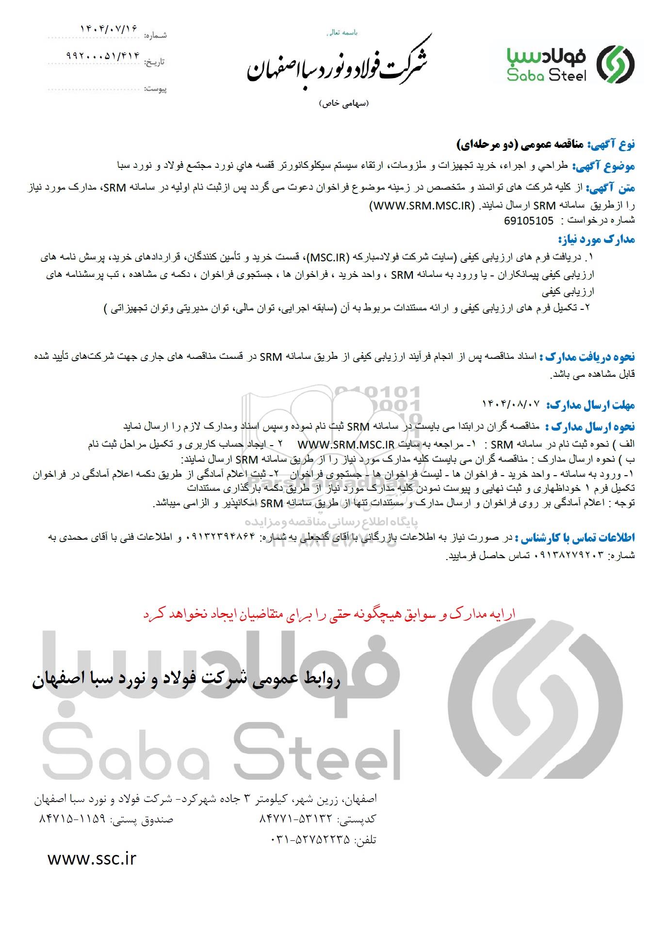موضوع آگهی: طراحی و اجراء ، خرید تجهیزات و ملزومات، ارتقاء سیستم سیکلو کانورتر قفسه های نورد مجتمع فولاد و نورد سبا
