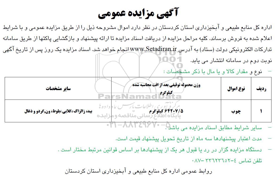 اداره کل منابع طبیعی و آبخیزداری استان کردستان در نظر دارد اموال مشروحه ذیل را از طریق مزایده عمومی و با شرایط اعلام شده به فروش برساند کلیه مراحل مزایده از دریافت اسناد مزایده تا ارائه پیشنهاد و بازگشایی پاکتها از طریق سامانه تداركات الکترونیکی دولت (ستاد به آدرس ستادایران انجام خواهد شد. اسناد مزایده یک روز پس از تاریخ آگهی نوبت دوم در سامانه انتشار می یابد.