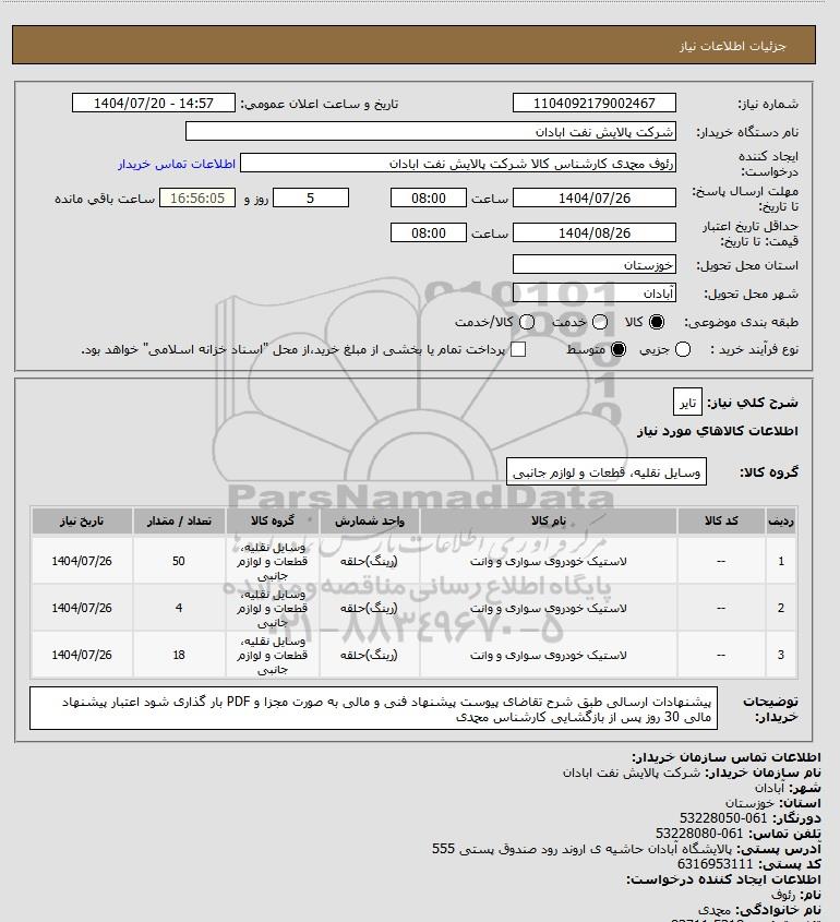 | 1 | -- | لاستیک خودروی سواری و وانت | (رینگ)حلقه | وسایل نقلیه، قطعات و لوازم جانبی | 50 | 1404/07/26 |