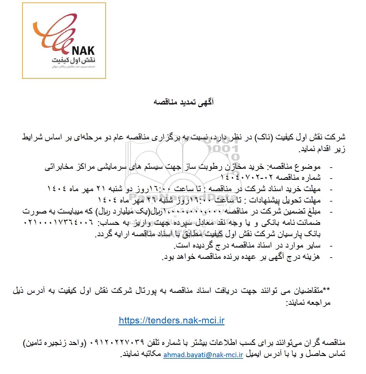 تمدید مناقصه خرید مخازن رطوبت ساز جهت سیستم های سرمایشی مراکز مخابراتی -مناقصه روز یکشنبه بیستم مهر ماه 1404 از کلیه افراد متخصص و شرکتها واجد شرایط دعوت به عمل میآید در مناقصه با کد خبرگزاری پارس نماد: 9686382 شرکت نمایند.
