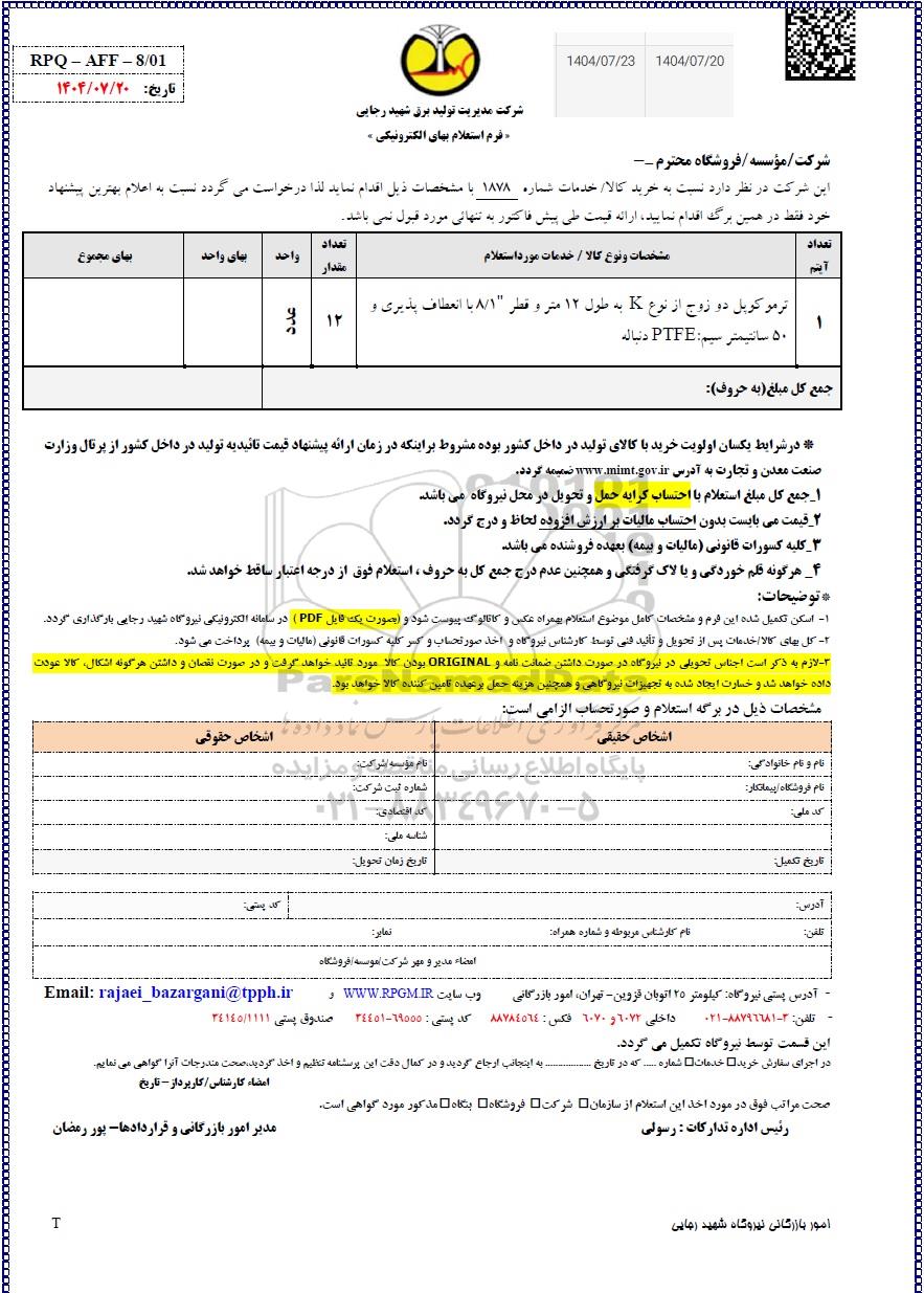 شرکت مدیریت تولید برق شهید رجایی فرم استعلام بهای الکترونیکی