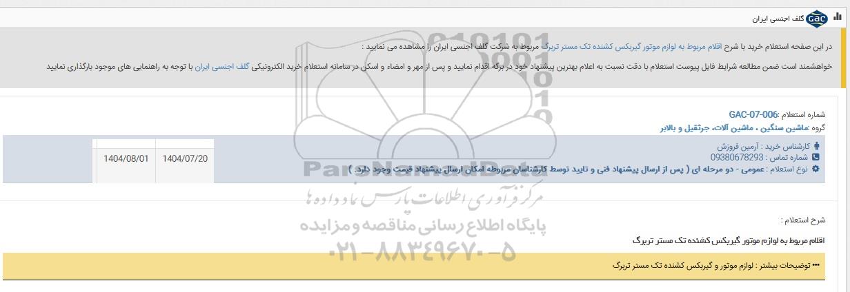 در این صفحه استعلام خرید با شرح اقلام مربوط به لوازم موتور گیربکس کشنده تک مستر تربرگ مربوط به شرکت گلف اجنسی ایران را مشاهده می نمایید