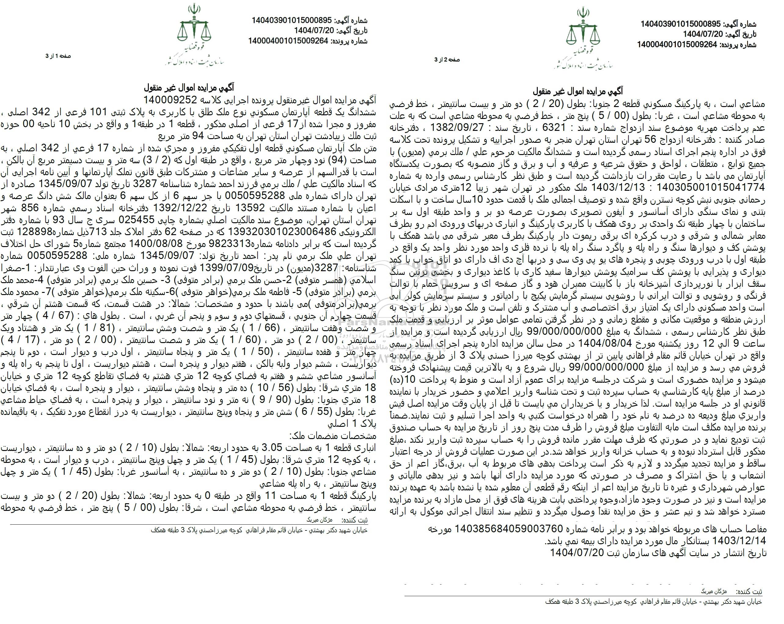 آگهی مزایده اموال غیر منقول پرونده اجرایی کلاسه 140009252 ششدانگ یک قطعه آپارتمان مسکوني نوع ملک طلق با کاربری به پلاک ثبتی 101 فرعی از 342 اصلی ، مفروز و مجزا شده از 17 فرعی از اصلی مذکور ، قطعه 1 در طبقه 1 و واقع در بخش 10 ناحيه 00 حوزه ثبت ملک زیبادشت تهران استان تهران به مساحت 94 متر مربع