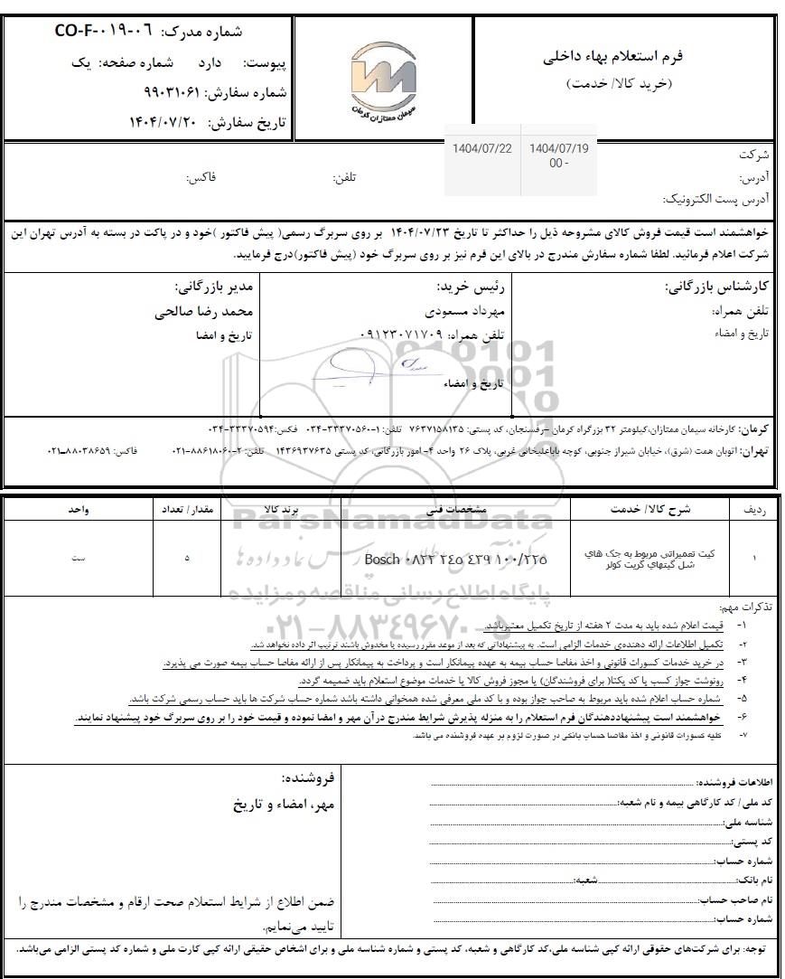 خواهشمند است قیمت فروش کالای مشروحه ذیل را حداکثر تا تاریخ 1404.07.23 بر روی سربرگ رسمی (پیش فاکتور) خود و در پاکت دربسته به ادرس تهران این شرکت اعلام فرمائید. لطفا شماره سفارش مندرج در بالای این فرم نیز بر روی سربرگ خود (پیش فاکتور) درج فرمایید.
