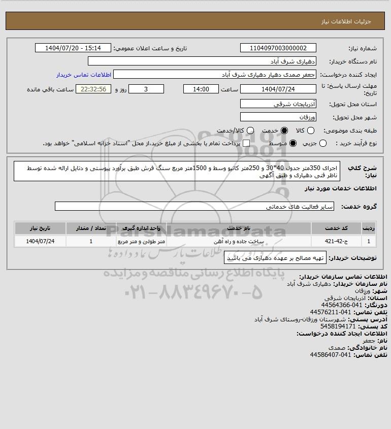 توضیحات خریدار:تهیه مصالح بر عهده دهیاری می باشد
