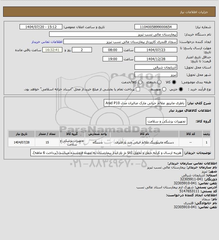 شرح کلی نیاز: باطری مانیتور علائم حیاتی مارک صاایران مدل Arad P10