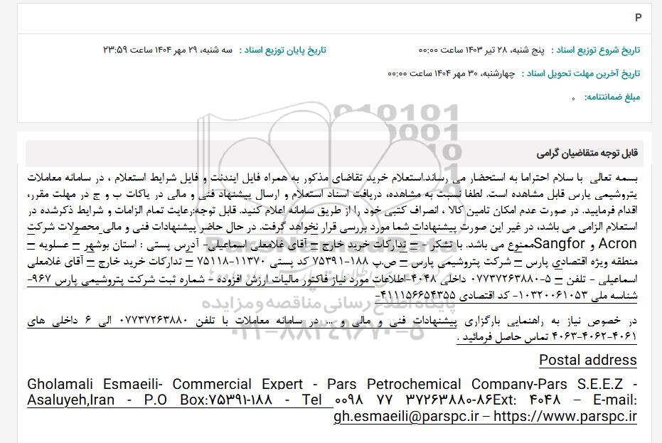 بسمه تعالی با سلام احتراما به استحضار می رساند. استعلام خرید تقاضای مذکور به همراه فایل ایندنت و فایل شرایط استعلام در سامانه معاملات پتروشیمی پارس قابل مشاهده است. لطفا نسبت به مشاهده دریافت اسناد استعلام و ارسال پیشنهاد فنی و مالی در پاکات ب و ج در مهلت مقرر اقدام فرمایید. در صورت عدم امکان تامین کالا . انصراف کتبی خود را از طریق سامانه اعلام کنید قابل توجه رعایت تمام الزامات و شرایط ذکر شده در استعلام الزامی میباشد در غیر این صورت پیشنهادات شما مورد بررسی قرار نخواهد گرفت. در حال حاضر پیشنهادات فنی و مالی محصولات شرکت Acron و Sangfor ممنوع میباشد با تشکر - تدارکات خرید خارج - آقای غلامعلی اسماعیلی آدرس پستی : استان بوشهر - عسلویه - منطقه ویژه اقتصادی پارس - شرکت پتروشیمی پارس - ص.ب 188 75391 کد پستی 11370 75118 - تدارکات خرید خارج - آقای غلامعلی اسماعیلی تلفن - 077372638805 داخلی 4048 اطلاعات مورد نیاز فاکتور مالیات ارزش افزوده شماره ثبت شرکت پتروشیمی پارس 967 شناسه ملی 10320061053 کد اقتصادی 411156654355