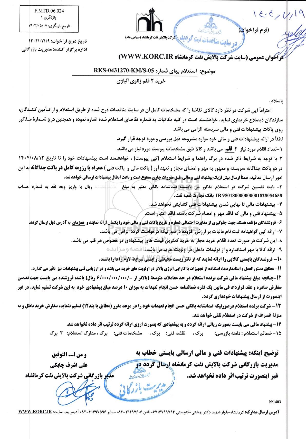 موضوع: استعلام بهای شماره RKS -0431270 -KM/S-05