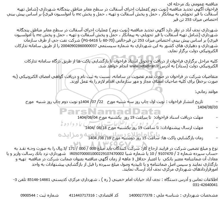 شهرداری نجف آباد در نظر دارد آگهی تجدید مناقصه (نوبت دوم) عملیات اجرای آسفالت، در سطح معابر مناطق پنجگانه شهرداری شامل تهیه آسفالت با قیر تحویلی به پیمانکار ، حمل و پخش آسفالت و تهیه ، حمل و پخش mc یا امولسیون قیری بر اساس پیش بینی اختصاص میزان 253 تن قیر خالص (70-60 با 6416-PG ) شرکت نفت جی از طرف سازمان شهرداری و دهیاری های کشور به این شهرداری به شماره سیستمی 20040902860000037 را از طریق سامانه تدارکات الکترونیکی دولت برگزار نماید.