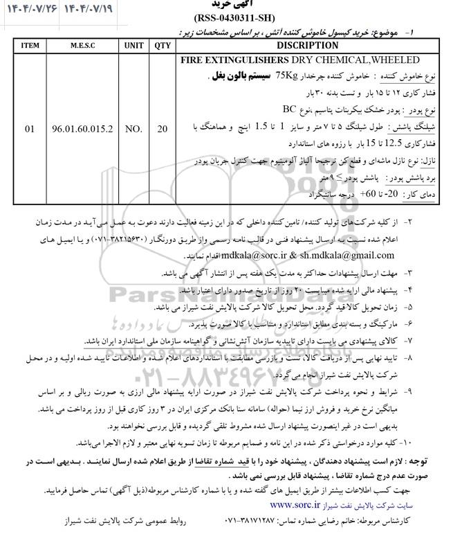 جهت کسب اطلاعات بیشتر از طریق ایمیلهای گفته شده و یا با شماره کارشناس مربوطه ذیل آگهی تماس حاصل فرمایید. سایت شرکت پالایش نفت شیراز www.sorc.ir