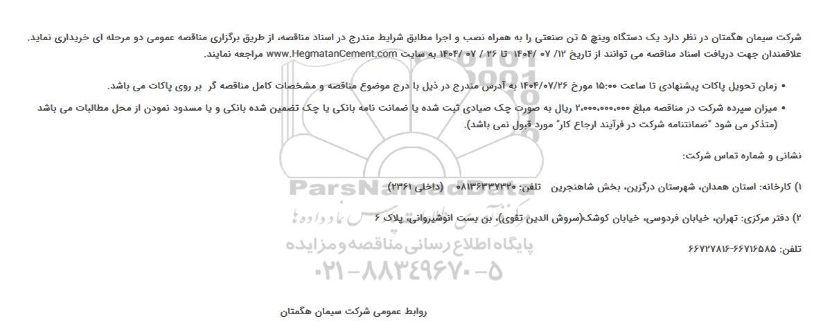 شرکت سیمان هگمتان در نظر دارد یک دستگاه وینچ 5 تن صنعتی را به همراه نصب و اجرا مطابق شرایط مندرج در اسناد مناقصه، از طریق برگزاری مناقصه عمومی دو مرحله ای خریداری نماید. علاقمندان جهت دریافت اسناد مناقصه میتوانند از تاریخ 1404.07.12 تا 1404.07.26 به سایت www.HegmatanCement.com مراجعه نمایند.