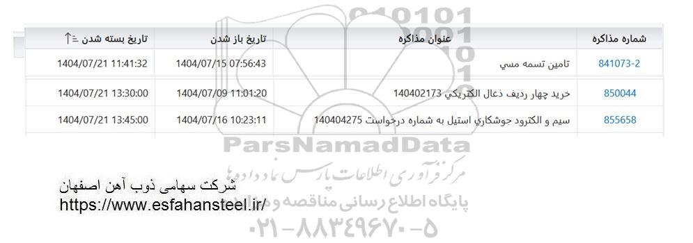 | 855658 | سیم و الکترود جوشکاری استیل به شماره درخواست | 1404.07.16 | 1404.07.21 |