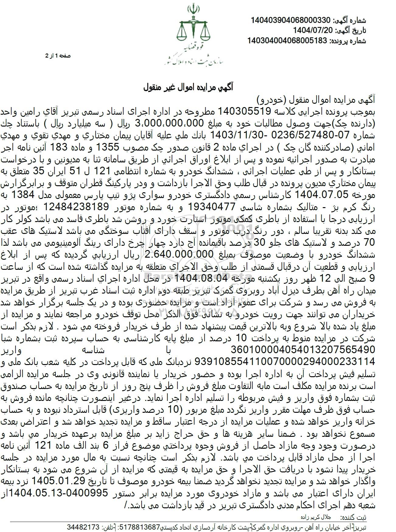 آگهی مزایده اموال منقول (خودرو)بموجب پرونده اجرایی کلاسه 140305519 مطروحه در اداره اجرای اسناد رسمی تبریز آقای رامین واحد دارنده چک جهت وصول مطالبات خود به مبلغ 3،000،000،000 ریال (سه میلیارد ریال) باستناد چک شماره 07-0236.527480 - 1403.11.30 بانک ملی علیه آقایان پیمان مختاری و مهدی تقوی و مهدی امانی صادر کننده گان چک در اجرای ماده 2 قانون صدور چک مصوب 1355 و ماده 183 آئین نامه اجر مبادرت به صدور اجرائیه نموده و پس از ابلاغ اوراق اجرائی از طریق سامانه ثنا به مدیونین و با درخواست بستانکار و پس از طی عملیات اجرائی ، ششدانگ خودرو به شماره انتظامی 121 ل 51 ایران 35 متعلق به پیمان مختاری مدیون پرونده در قبال طلب وحق الاجرا بازداشت و و در پارکینگ قطران متوقف و برابرگزارش مورخه 1404.07.05 کارشناس رسمی دادگستری خودرو سواری پژو تیپ پارس معمولی مدل 1384 به رنگ کرم بژ - متالیک بشماره شاسی 19340477 و به شماره موتور 12484238189 ؛ موتور در ارزیابی درجا با استفاده از باطری کمکی موتور استارت خورد و روشن شد باطری فاسد می باشد کولر کار میکند بدنه تقریبا سالم ، دور رنگ درب موتور و سقف دارای آفتاب سوختگی میباشد لاستیک های عقب 70 درصد و لاستیکهای جلو 30 درصد باقیمانده آج دارد چهار چرخ دارای رینگ آلومینیومی می باشد لذا ششدانگ خودرو با وضعیت موصوف بمبلغ 2.640.000.000 ریال ارزیابی گردیده که پس از ابلاغ ارزیابی و قطعیت آن در قبال قسمتی از طلب وحق الاجرای متعلقه به مزایده گذاشته شده است که از ساعت 9 صبح الی 12 ظهر روز یکشنبه مورخه 1404.08.04 در محل اداره اجرای اسناد رسمی واقع در تبریز میدان راه آهن بطرف دیزل آباد روبروی گمرک تبریز طبقه دوم اداره ثبت اسناد غرب تبریز از طریق مزایده به فروش میرسد و شرکت برای عموم آزاد است و مزایده حضوری بوده و در یک جلسه برگزار خواهد شد خریداران میتوانند جهت رویت خودرو به نشانی فوق الذکر محل توقف خودرو مراجعه نمایند و مزایده از مبلغ یاد شده بالا شروع و به بالاترین قیمت پیشنهاد شده از طرف خریدار فروخته میشود . لازم بذکر است شرکت در مزایده منوط به پرداخت 10 درصد از مبلغ پایه کارشناسی به حساب سپرده ثبت بشماره شبا 360100004054013207565490 با شناسه واریز939108554110070000294000233114 نزد بانک ملی که قابل پرداخت در کلیه شعب بانک ملی وتسلیم فیش پرداخت آن به اداره اجرا بوده و حضور خریدار یا نماینده قانونی وی در جلسه مزایده الزامی است برنده مزایده مکلف است ما به التفاوت مبلغ فروش را ظرف پنج روز از تاریخ مزایده به حساب صندوق ثبت بشماره فوق واریز و فیش مربوطه را تسلیم اداره اجرا نماید در غیر اینصورت چنانچه مانده فروش به حساب فوق ظرف مهلت مقرر واریز نگردد مبلغ مزبور (10) درصد واریزی قابل استرداد نبوده و به حساب خزانه واریز خواهد شده و عملیات مزایده از درجه اعتبار ساقط و مزایده تجدید خواهد شد و اعتراض بعدی مسموع نخواهد بود. ضمنا سایر هزینه ها و حق حراج زاید بر مبلغ مزایده بر عهده خریدار می باشد و در صورت وجود وجه مازاد حاصل از فروش وجوه پرداختی موضوع فراز 6 بند الف ماده 121 آئین نامه اجرا از محل مازاد قابل پرداخت می باشد. لازم بذکر است چنانچه نسبت به مال مورد مزایده در جلسه خریدار پیدا نشود با دریافت حق الاجرا و حق مزایده به قیمتی که مزایده از آن شروع می شود به بستانکار واگذار خواهد شد و مزایده تجدید نخواهد گردید ضمنا بیمه خودرو موصوف تا تاریخ 1405.01.29 نزد بیمه ایران دارای اعتبار می باشد و مازاد خودروی مورد مزایده برابر دستور 0400995-1404.05.13 از شعبه دهم اجرای احکام مدنی دادگستری تبریز در قید بازداشت می باشد.