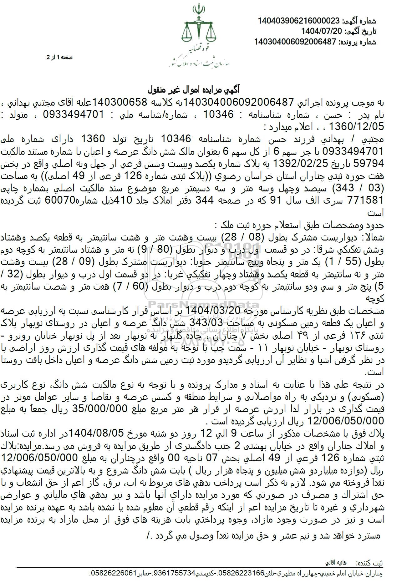 مجتبی / بهدانی فرزند حسن شماره شناسنامه 10346 تاریخ تولد 1360 دارای شماره ملی 0933494701 با جز سهم 6 از کل سهم 6 بعنوان مالک شش دانگ عرصه و اعیان با شماره مستند مالکیت 59794 تاریخ 1392/02/25 به پلاک شماره یکصد و بیست و شش فرعی از چهل و نه اصلی واقع در بخش هفت حوزه ثبتی چناران استان خراسان رضوی ((پلاک ثبتی شماره 126 فرعی از 49 اصلی)) به مساحت (03 /343) سیصد و چهل و سه متر و سه دسیمتر مربع موضوع سند مالکیت اصلی بشماره چاپی 771581 سری الف سال 91 که در صفحه 344 دفتر املاک جلد 410 ذیل شماره 60070 ثبت گردیده است