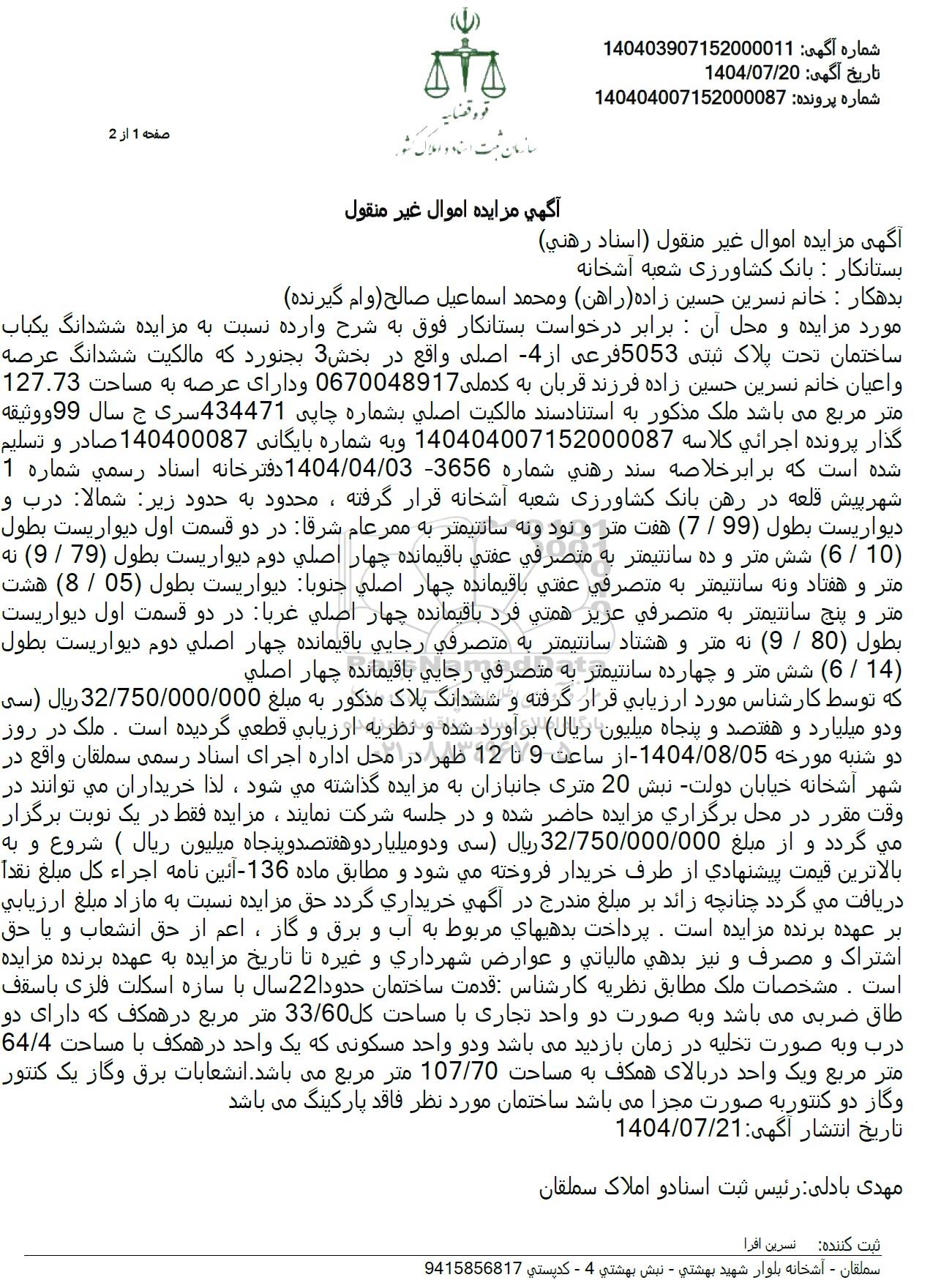 آگهی مزایده اموال غیر منقول (اسناد رهنی)