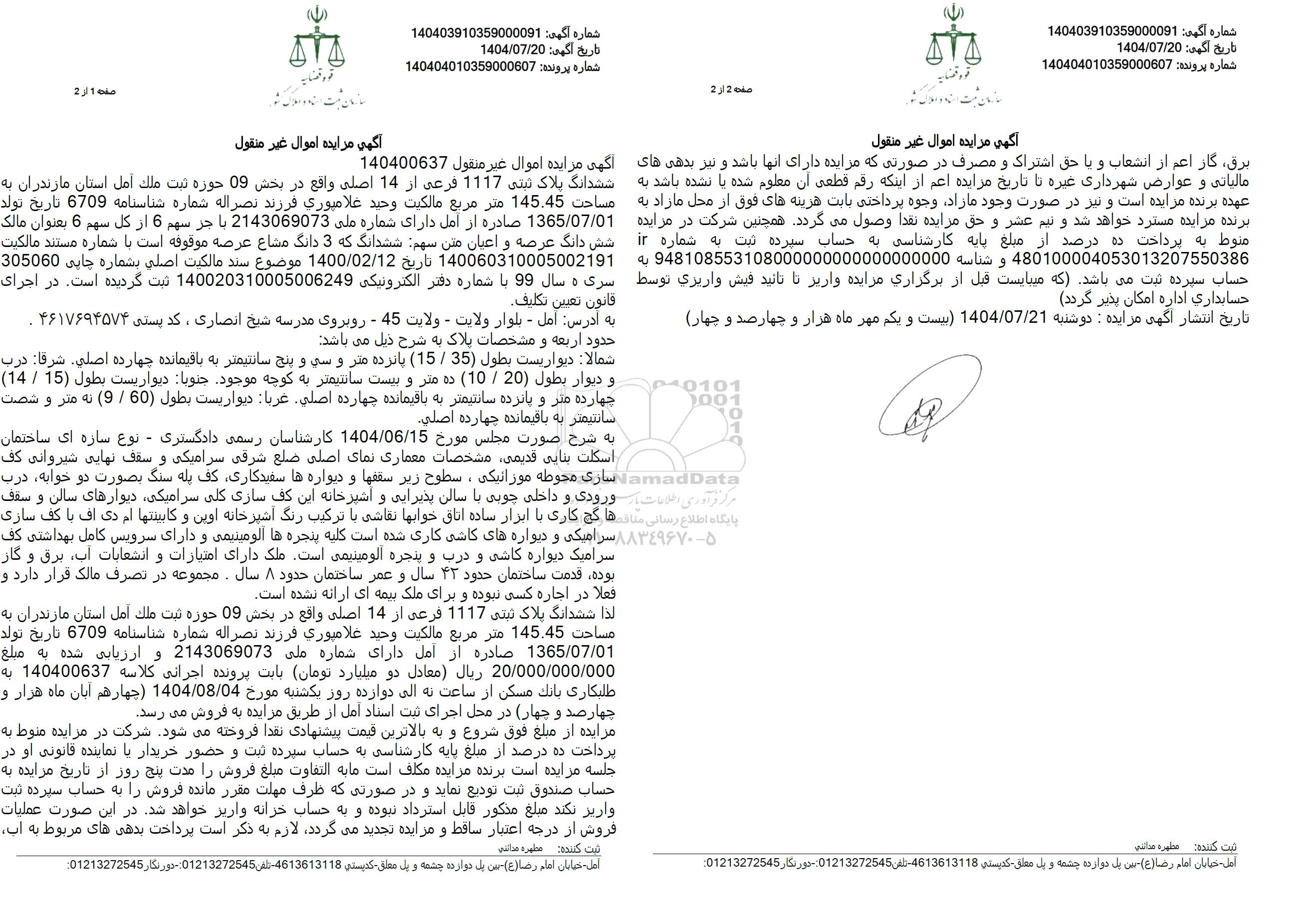 لذا ششدانگ پلاک ثبتی 1117 فرعی از 14 اصلی واقع در بخش 09 حوزه ثبت ملک آمل استان مازندران به مساحت 145.45 متر مربع مالکت وحید علاموری فرزند نصراله شماره شناسنامه 6709 تاریخ تولد 1365.07.01 صادره از اول دارای شماره ملی 2143069073 و ارزیابی شده به مبان 20.000.000.000 ریال (معادل دو میلیارد تومان بابت پرونده اجرائی کلاسه 140400637 به طلبکاری بانک مسکن از ساعت به الی دوازده روز یکشنبه مورخ 1404.08.04 (چهارهم آبان ماه هزار و چهارصد و چهار در محل اجرای ثبت اسناد آمل از طریق مزایده به فروش می رسد.