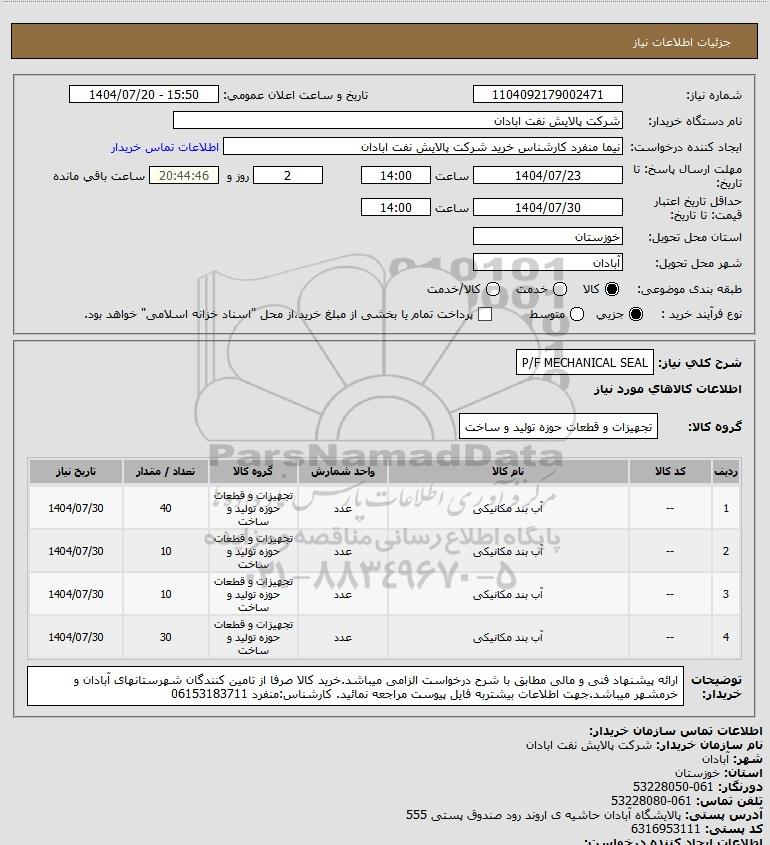 | 4 | -- | آب بند مکانیکی | عدد | تجهیزات و قطعات حوزه تولید و ساخت | 30 | 1404/07/30 |