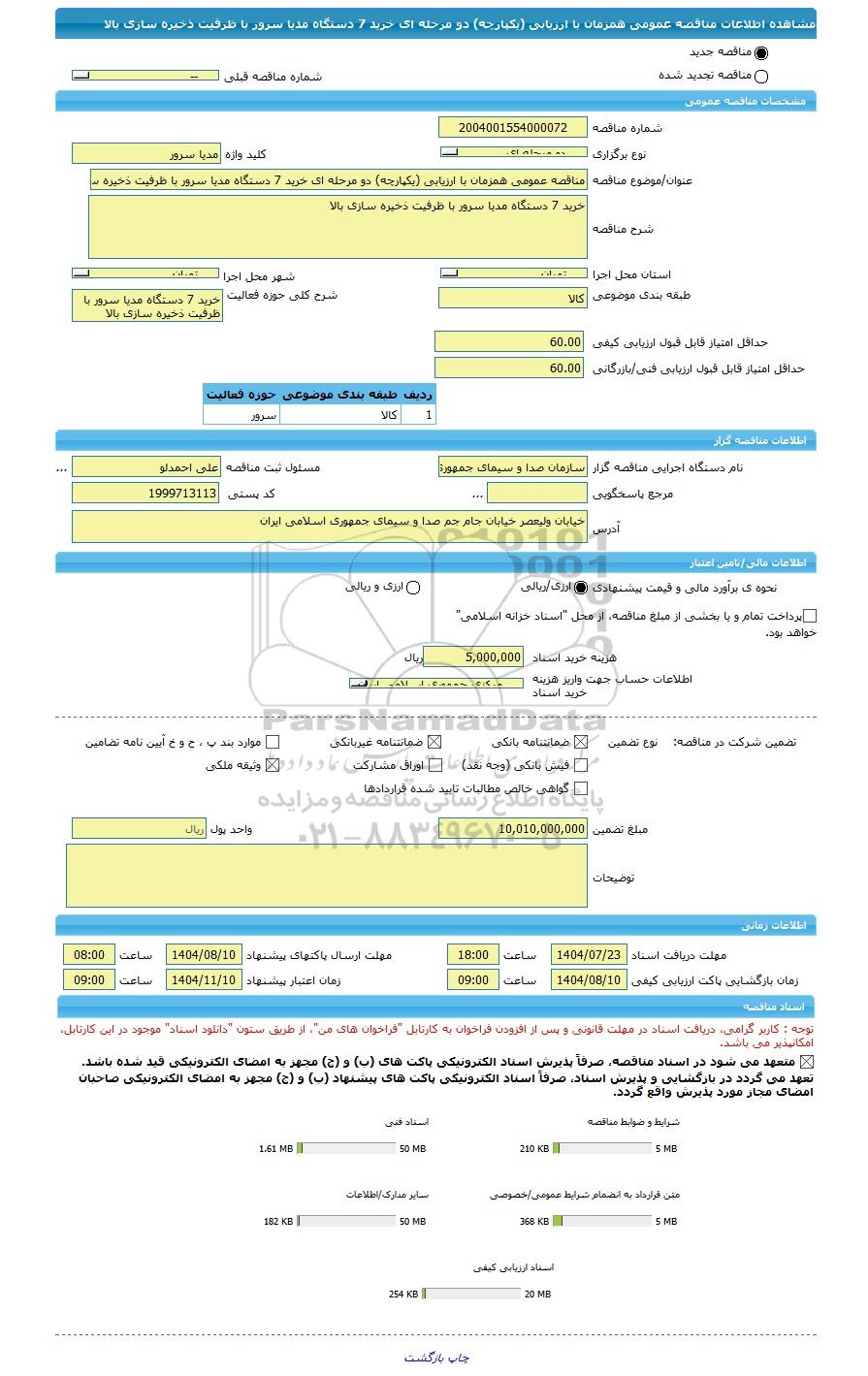 | عنوان/موضوع مناقصه | مناقصه عمومی همزمان با ارزیابی (یکپارچه) دو مرحله ای خرید 7 دستگاه مدیا سرور با ظرفیت ذخیره سازی بالا | ||||||||