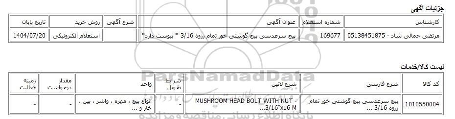 مرتضی جمالی شاد - 05138451875169677پیچ سرعدسی پیچ گوشتی خور تمام رزوه 3/16 * پیوست دارد*استعلام الکترونیکی1404/07/20
