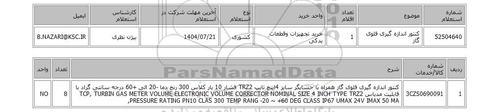 52504640 | کنتور اندازه گیری فلوی گاز | 1 | خرید تجهیزات وقطعات یدکی | کشوری | 1404/07/21 | بیژن نظری | B.NAZARI@KSC.IR |