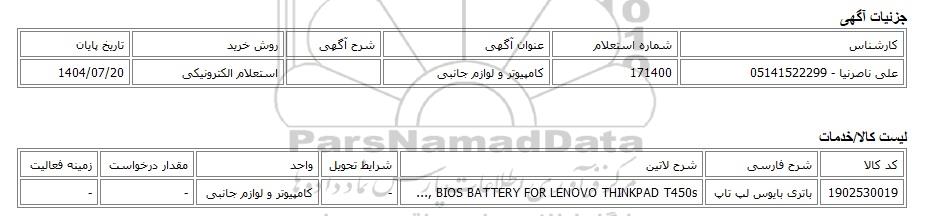 1902530019 | باتری بایوس لپ تاپ | BIOS BATTERY FOR LENOVO THINKPAD T450s ,... | - | کامپیوتر و لوازم جانبی | - | - |