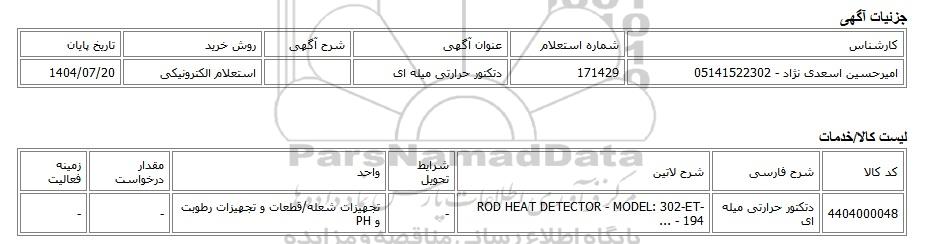 امیرحسین اسعدی نژاد - 05141522302171429دتکتور حرارتی میله ایاستعلام الکترونیکی1404/07/20