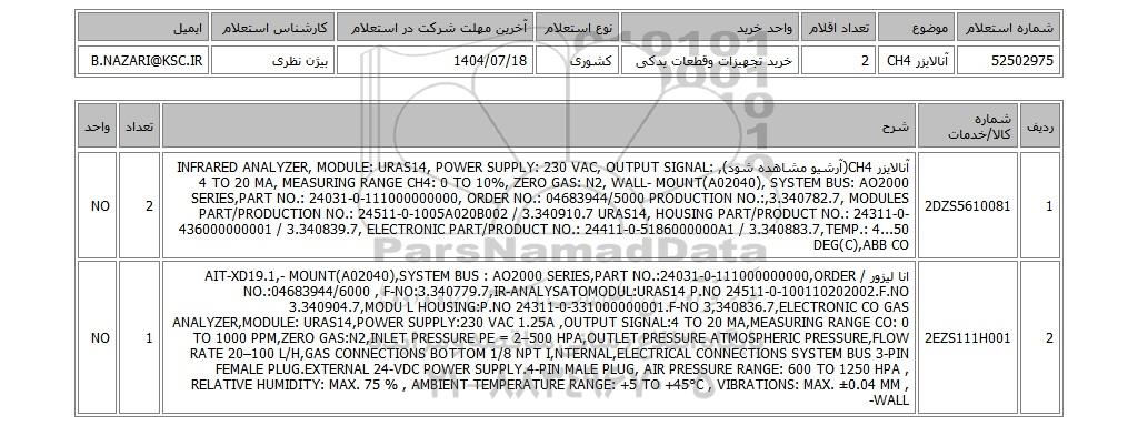 52502975آنالایزر CH42خرید تجهیزات وقطعات یدکیکشوری1404/07/18بیژن نظریB.NAZARI@KSC.IR