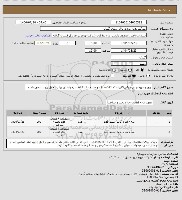 نام سازمان خریدار: شرکت توزیع نیروی برق استان گیلان