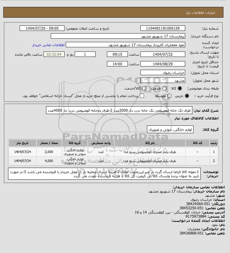 | 2 | -- | ظرف یکبار مصرف آلومینیومی سرو غذا | عدد | لوازم خانگی، صوتی و تصویری | 4,000 | 1404/07/24 |