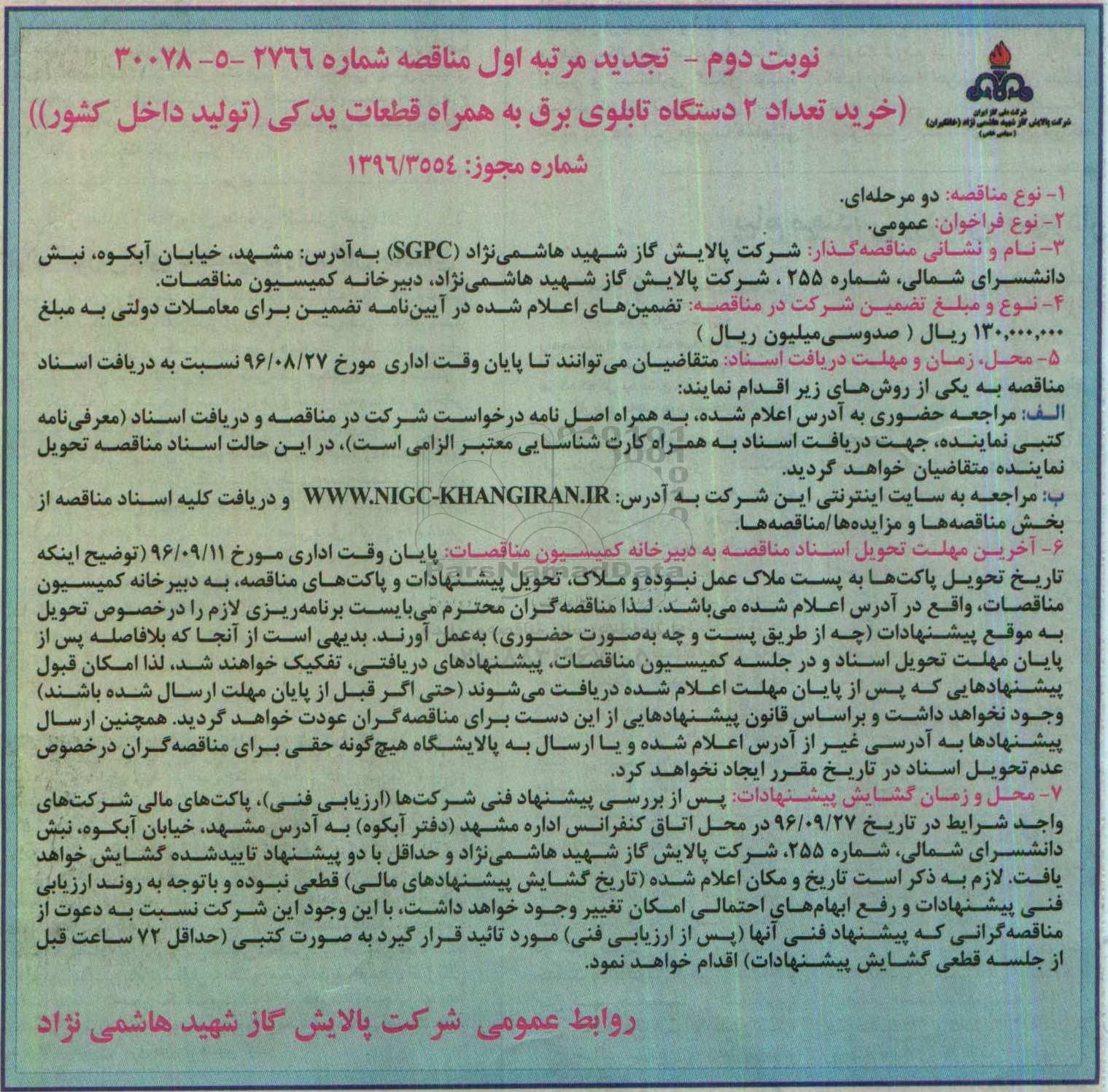تجدید مناقصه خرید 2 دستگاه تابلوی برق به همراه قطعات یدکی - نوبت دوم , مناقصه, تجدید مناقصه خرید 2 دستگاه تابلوی برق به همراه قطعات یدکی - نوبت دوم