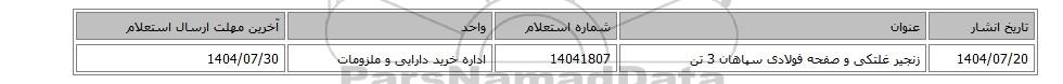 | 1404/07/20 | زنجیر غلتکی و صفحه فولادی سپاهان 3 تن | 14041807 | اداره خرید دارایی و ملزومات | 1404/07/30 |