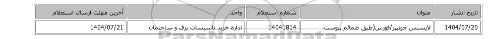 1404/07/20لایسنس جونیپر/فورس(طبق ضمائم پیوست14041814اداره خرید تاسیسات برق و ساختمان1404/07/21