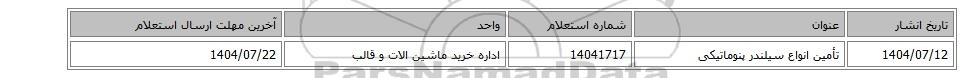 | 1404/07/12 | تأمین انواع سیلندر پنوماتیکی | 14041717 | اداره خرید ماشین الات و قالب | 1404/07/22 |