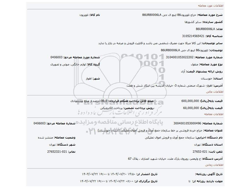 عنوان معامله: حراج خرده فروشی بر خط سازمان جمع آوری و فروش اموال تملیکی (استان خوزستان)