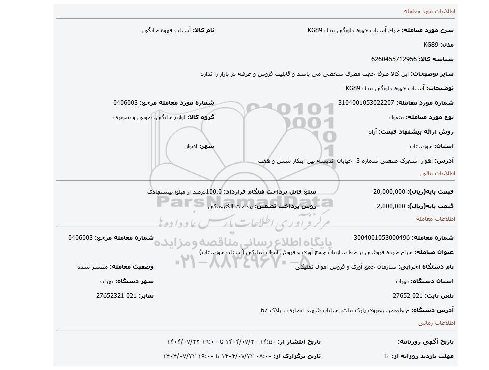| عنوان معامله: حراج خرده فروشی بر خط سازمان جمع آوری و فروش اموال تملیکی (استان خوزستان) | ||