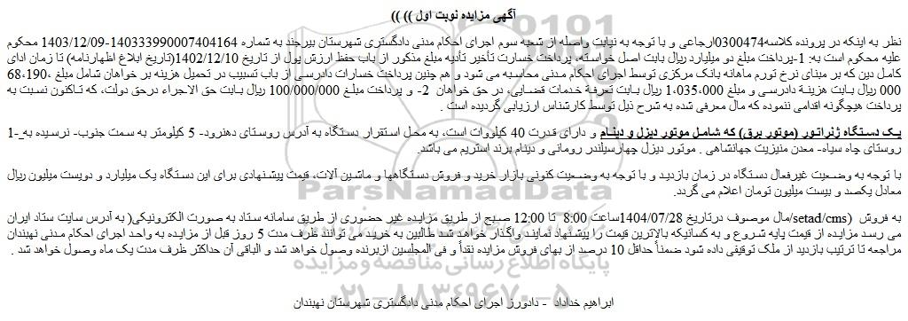 1- یک دستگاه ژنراتور (موتور برق) که شامل موتور دیزل و دینام و دارای قدرت 40 کیلووات است، به محل استقرار دستگاه به آدرس روستای دهنرود- 5 کیلومتر به سمت جنوب- نرسیده به روستای چاه سیاه- معدن منیزیت جهانشاهی . موتور دیزل چهارسیلندر رومانی و دینام برند استریم می باشد.