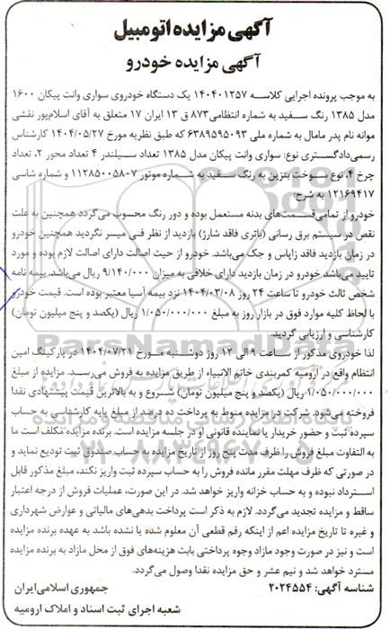 مزایده یک دستگاه خودروی سواری وانت پیکان, مزایده یک دستگاه خودروی سواری وانت پیکان