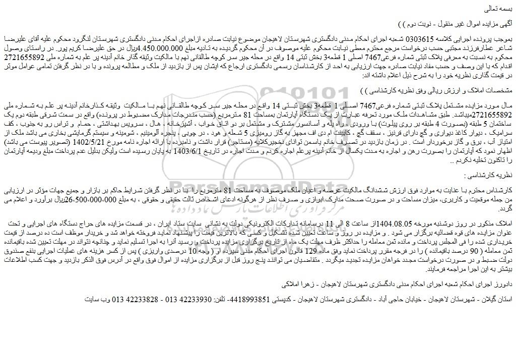 بموجب پرونده اجرایی کلاسه 0303615 شعبه اجرای احکام مدنی دادگستری شهرستان لاهیجان موضوع نیابت صادره ازاجرای احکام مدنی دادگستری شهرستان لنگرود محکوم علیه آقای علیرضا شاعر عطارفرزند مجتبی حسب درخواست مرجع محترم معطی نیابت محکوم علیه موصوف در آن محکوم گردیده به تادیه مبلغ 4.450.000.000ریال در حق علیرضا کریم پور. در راستای وصول محکوم به نسبت به معرفی پلاک ثبتی شماره فرعی7467 اصلی 1 قطعه3 بخش ثبتی 14 واقع در محله جیر سر کوچه طالقانی نهم با مالکیت وثیقه گذار خانم آدینه پر علم به شماره ملی 2721655892 اقدام که با این وصف و حسب مفاد نیابت صادره جهت ارزیابی به احد از کارشناسان رسمی دادگستری ارجاع که ایشان پس از بازدید از ملک و مطالعه پرونده و با در نظر گرفتن تمامی عوامل موثر در قیمت گذاری نظریه خود را به شرح ذیل اعلام داشته اند: