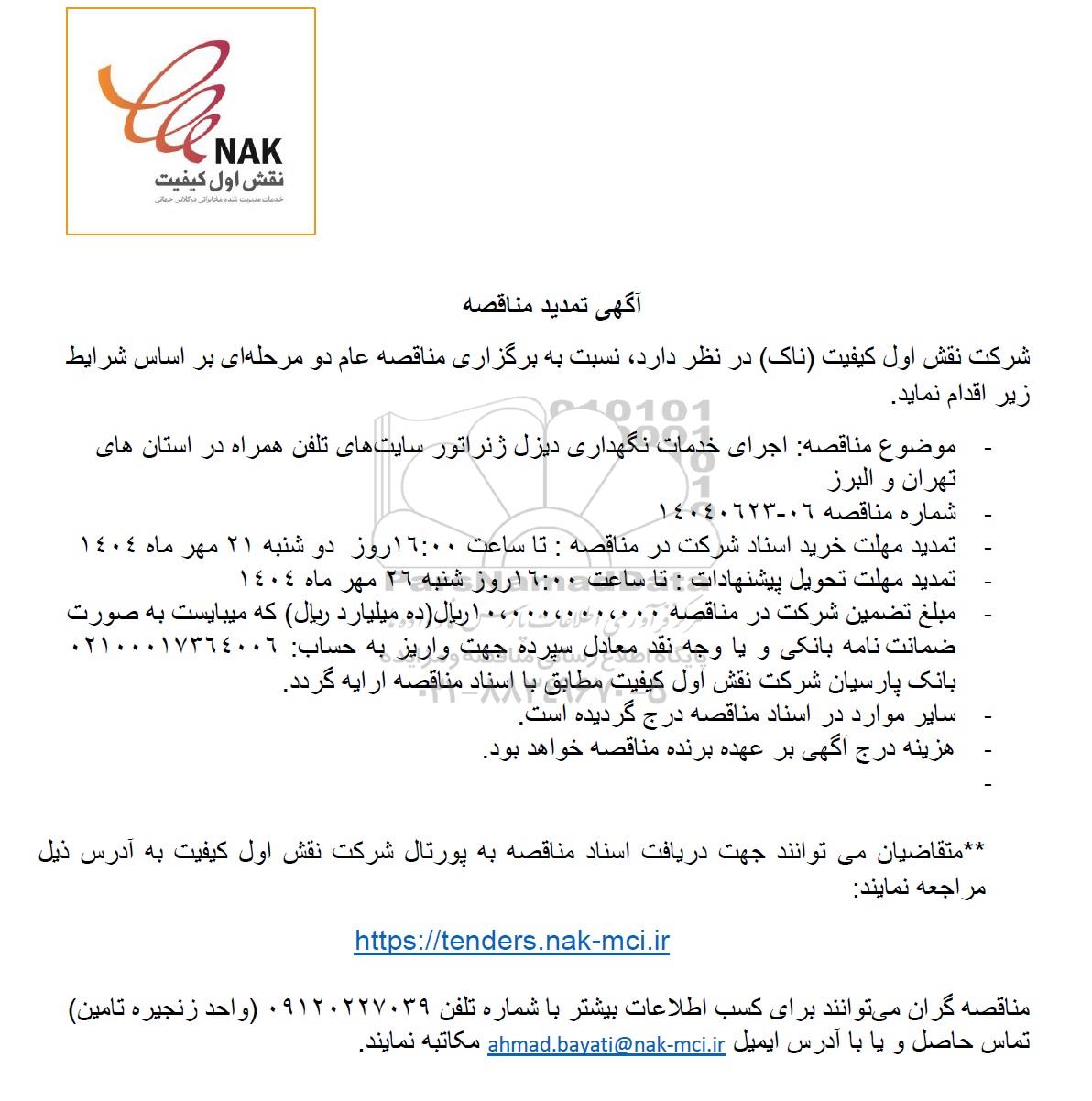تمدید مناقصه اجرای خدمات نگهداری دیزل ژنراتور سایت های تلفن همراه در استان های از کلیه افراد متخصص و شرکتها واجد شرایط دعوت به عمل میآید در مناقصه با کد خبرگزاری پارس نماد: 9688005 شرکت نمایند.