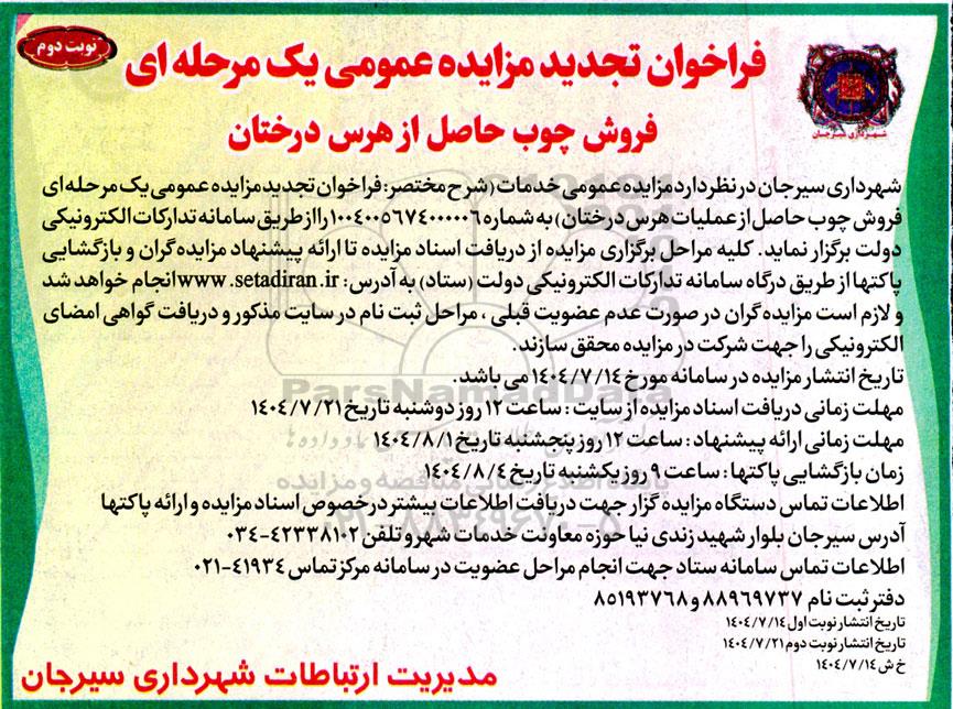 شهرداری سیرجان در نظر دارد مزایده عمومی خدمات (شرح مختصر: فراخوان تجدید مزایده عمومی یک مرحله ای فروش چوب حاصل از هرس درختان) به شماره 1004005674000006 را از طریق سامانه تدارکات الکترونیکی دولت برگزار نماید. کلیه مراحل برگزاری مزایده از دریافت اسناد مزایده تا ارائه پیشنهاد مزایده گران و بازگشایی پاکتها از طریق درگاه سامانه تدارکات الکترونیکی دولت (ستاد) ایران انجام خواهد شد و لازم است مزایده گران در صورت عدم عضویت قبلی، مراحل ثبت نام در سایت مذکور و دریافت گواهی امضای الکترونیکی را جهت شرکت در مزایده محقق سازند.