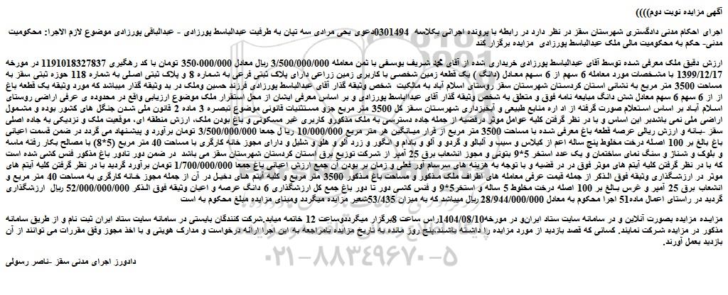 اجرای احکام مدنی دادگستری شهرستان سقز در نظر دارد در رابطه با پرونده اجرائی بکلاسه 0301494دعوی یحی مرادی سه تپان به طرفیت عبدالباسط پورزادی - عبدالباقی پورزادی موضوع لازم الاجرا: محکومیت مدنی- حکم به محکومیت مالی ملک عبدالباسط پورزادی مزایده برگزار کند