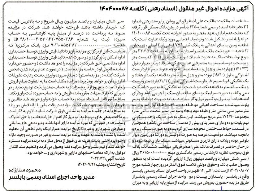 مشخصات مالکیت: مالکیت علی اصغر قربانی روشن برابر سند رهنی شماره 34 دفترخانه اسناد رسمی شماره 425 بابلسر در رهن بانک مسکن قرار گرفته که بعلت عدم ایفای تعهد منجر به صدور اجرائیه تحت کلاسه 140400086 در اجرا بابلسر تشکیل شده و توصیف اجمالی مورد وثیقه عبارت است یک قطعه زمین با بنای احداثی به پلاک ثبتی 774 فرعی از 3 اصلی ، در بخش 12 ناحیه 00 حوزه ثبت ملک بابلسر استان مازندران به مساحت 311.15 متر مربع توضیحات ملک به حدود شمالا دیواریست بطول (20.22) بیست متر و بیست و دو سانتیمتر به متصرفی عباس بزرگی شرقا درب و دیوار بطول (43. 14) چهارده متر و چهل و سه سانتیمتر به کوچه جنوبا سیم خارداریست اشتراکی بطول (19.40) نوزده متر و چهل سانتیمتر به قطعه یکصد و هفتاد و یک تفکیکی غربا سیم خارداریست اشتراکی بطول (11.21) یازده متر و بیست و یک سانتیمتر به قطعه یکصد و شصت و نه تفکیکی بنا به صورت اسکلت بتنی و کف به صورت سرامیک و نمای ساختمان سنگ و آجر میباشد و دارای انشعابات آب برق دو کنتور برق و گاز میباشد. بنا به صورت دو طبقه و نیم پلوت میباشد و مساحت اعیانی دو طبقه به مساحت طبقه اول صد و نوزده متر ممیز سی سانتی متر و طبقه دوم پنجاه و سه متر ممیز شصت سانتی متر مجموعا 172.90 متر مربع میباشد. این ملک به صورت یک واحد مسکونی نیم پلوت بوده و دارای عمر بنای بیش از ده سال ساخت میباشد و همچنین در قسمت حیاط ساختمان محوطه سازی گردیده و به صورت سنگ ریزه و باغچه میباشد. موقعیت عرصه به صورت دو نبش و دور تا دور زمین دیوار بلوکی بوده و پلاک دارای کاربری مسکونی میباشد ملک دارای بیمه نبوده و در حال حاضر در تصرف مالک علی اصغر قربانی میباشد ششدانگ پلاک فوق بموجب نظریه کارشناس رسمی دادگستری مبلغ 36.500.000.000 ریال سی شش میلیارد و پانصد میلیون ریال ارزیابی گردیده است که به منظور وصول طلب بانک و حقوق دولتی کلاسه فوق الذکر در روز چهار شنبه مورخ 1404.08.07 از ساعت 9 الی 12 ظهر در واحد اجرای اسناد رسمی بابلسر واقع در بابلسر - پاسداران بیست و دو - واحد اجرای اسناد رسمی بابلسر از طریق مزایده حضوری بفروش میرسد. مزایده از مبلغ پایه ارزیابی و به میزان سی شش میلیارد و پانصد میلیون ریال شروع و به بالاترین قیمت که خریدار داشته باشد فروخته خواهد شد شرکت در مزایده منوط به پرداخت ده درصد از مبلغ پایه کارشناسی به حساب سپرده ثبت به شماره 480100004053013207550386 IR و شناسه 902108553113000000000000000000 نزد بانک مرکزی که میبایست قبل از برگزاری مزایده واریز تا تائید فیش واریزی توسط حسابداری اداره امکان پذیر گردد و در صورت عدم تائید فیش واریزی توسط حسابداری اداره متقاضی حق شرکت در مزایده را نخواهد داشت ) و حضور خریدار با نماینده قانونی او در جلسه مزایده است. ( در صورت عدم برنده شدن شخص شرکت کننده در مزایده استرداد مبلغ سپرده واریزی بعلت رعایت تشریفات اداری زمان بر خواهد بود برنده مزایده مکلف است ما به التفاوت مبلغ فروش را ظرف مدت پنج روز از تاریخ مزایده به حساب صندوق ثبت تودیع نماید و در صورتی که ظرف مهلت مقرر مانده فروش را به حساب سپرده ثبت واریز نکند مبلغ مذکور قابل استرداد نبوده و به حساب خزانه واریز خواهد شد طالبین و خریداران میتوانند جهت شرکت در مزایده در وقت مقرر با ارائه فیش مربوطه به مبلغ پایه در جلسه مزایده به نشانی فوق شرکت نمایند. لازم به ذکر است پرداخت بدهیهای مربوط به آب برق گاز اعم از حق انشعاب و یا حق اشتراک و مصرف در صورتی که مورد مزایده دارای آنها باشد و نیز بدهی های مالیاتی و عوارض شهرداری و غیره تا تاریخ مزایده اعم از اینکه رقم قطعی آن معلوم شده یا نشده باشد به عهده برنده مزایده است و غیر در صورت وجود مازاد وجوه پرداختی بابت هزینه های فوق از محل مازاد به برنده مزایده مسترد خواهد شد و نیم عشر و حق مزایده نقدا وصول میگردد و تنظیم سند انتقال موکول به ارائه مفاصا حسابهای دارایی و شهرداری و .... خواهد بود. شناسه آگهی : 2019173